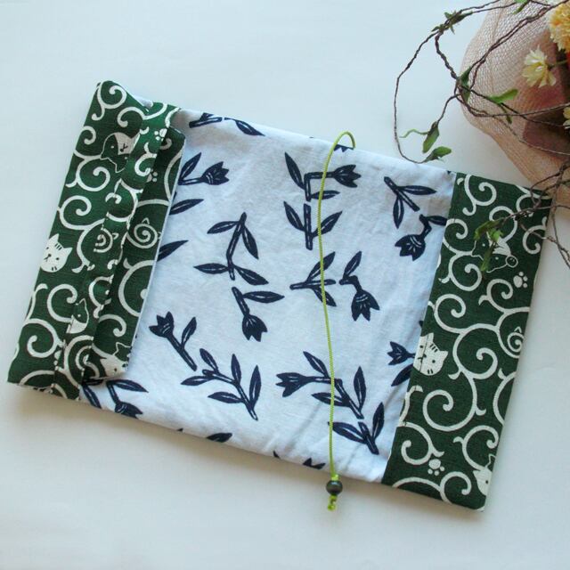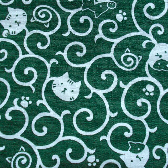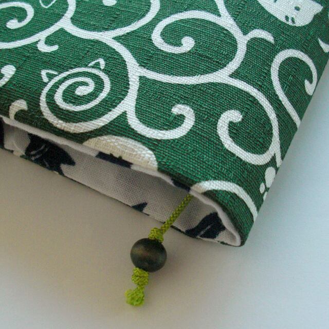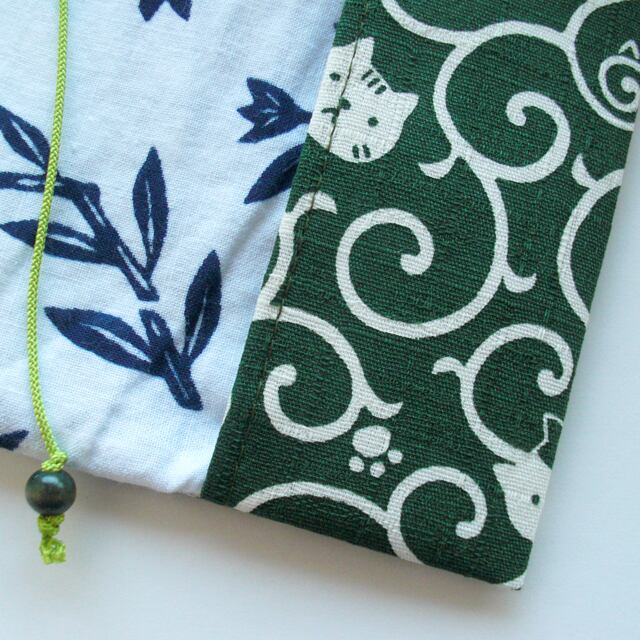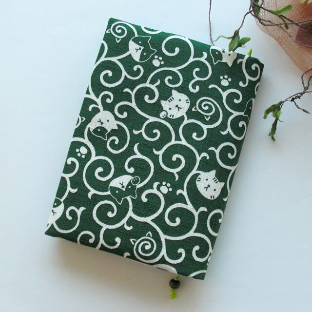文庫サイズのブックカバーです。和かわいい、伝統の唐草模様に猫が顔を出しています。