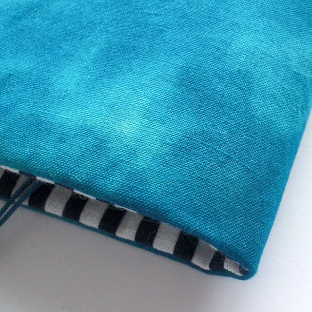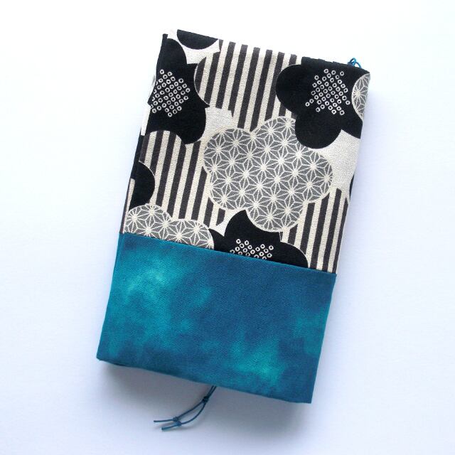 新書サイズのブックカバーです。シンプルな梅の花にターコイズの生地を合わせました。
